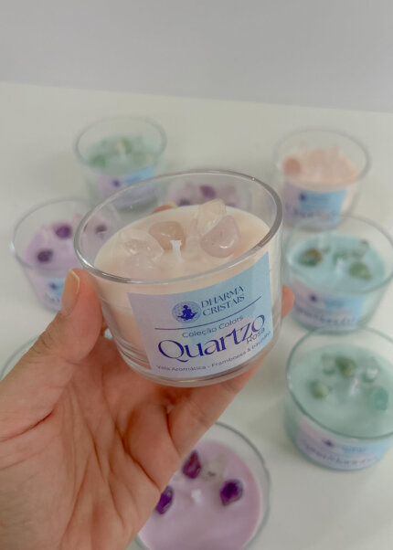 Vela Aromática Quartzo Rosa com Cristais Naturais | Framboesa e Baunilha | Coleção Colors — Dharma Cristais