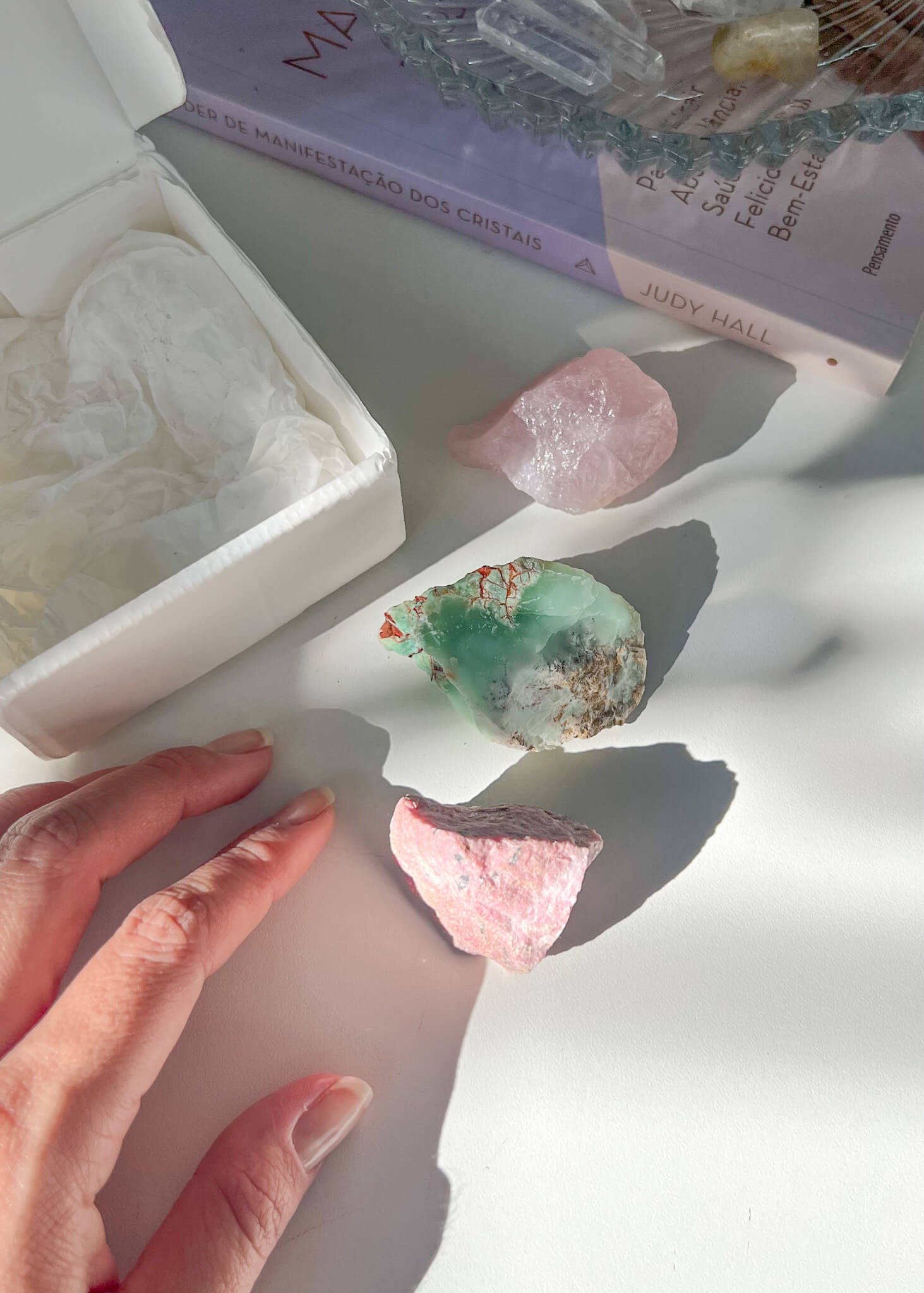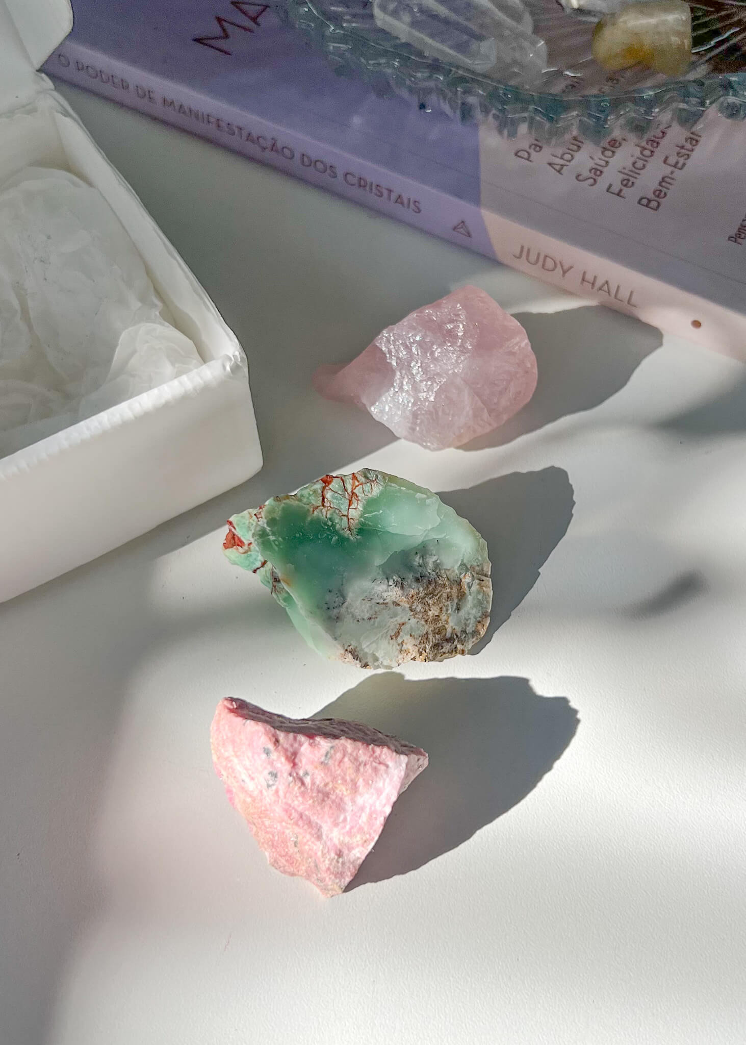 Kit de Cristais para Amor-próprio e Merecimento – Quartzo Rosa, Crisóprasio e Rodocrosita