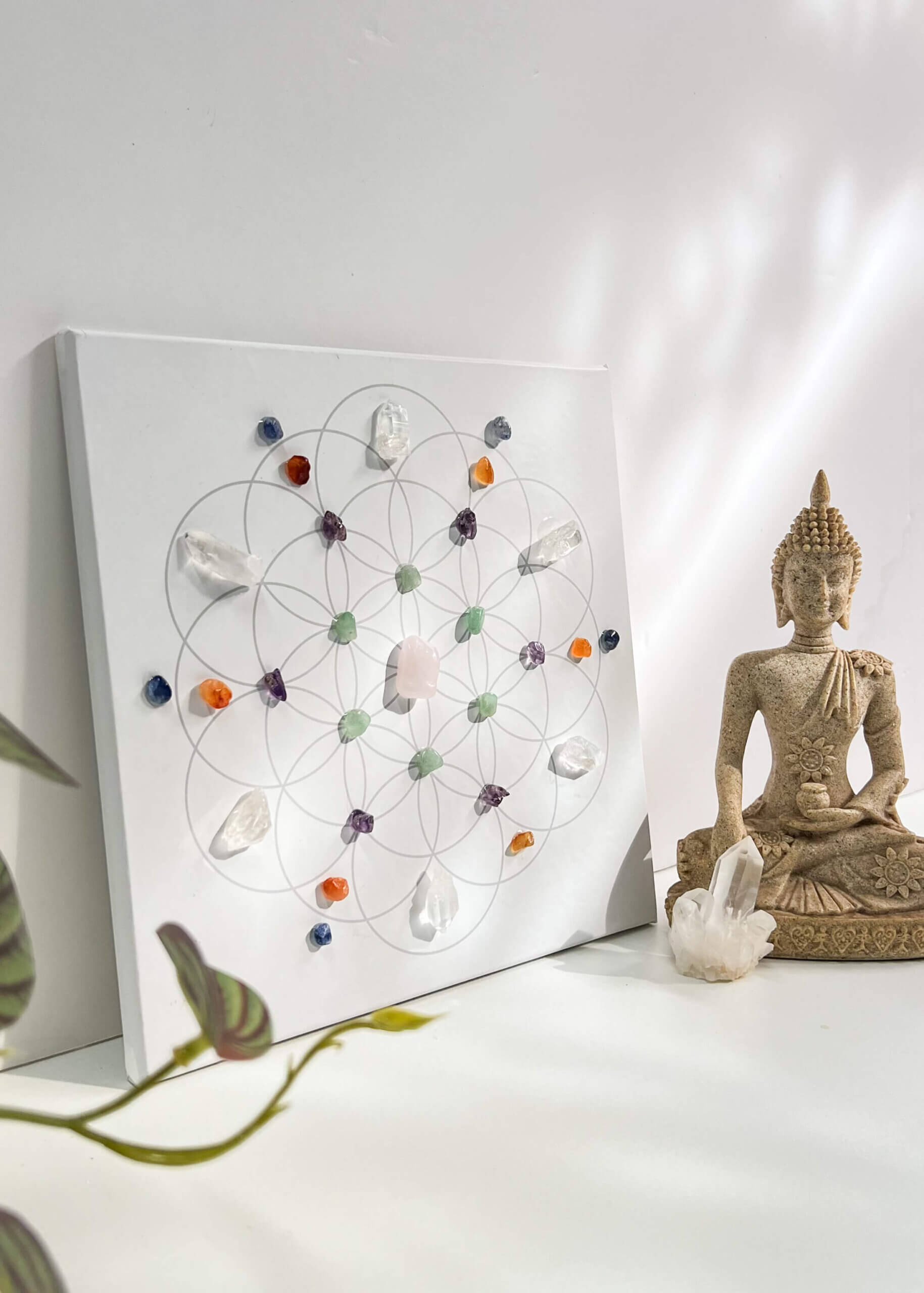 Feito à mão com cristais naturais colados um a um sobre a mandala da Flor da Vida, é ideal para quem deseja transformar o ambiente em um espaço de cuidado e conexão.