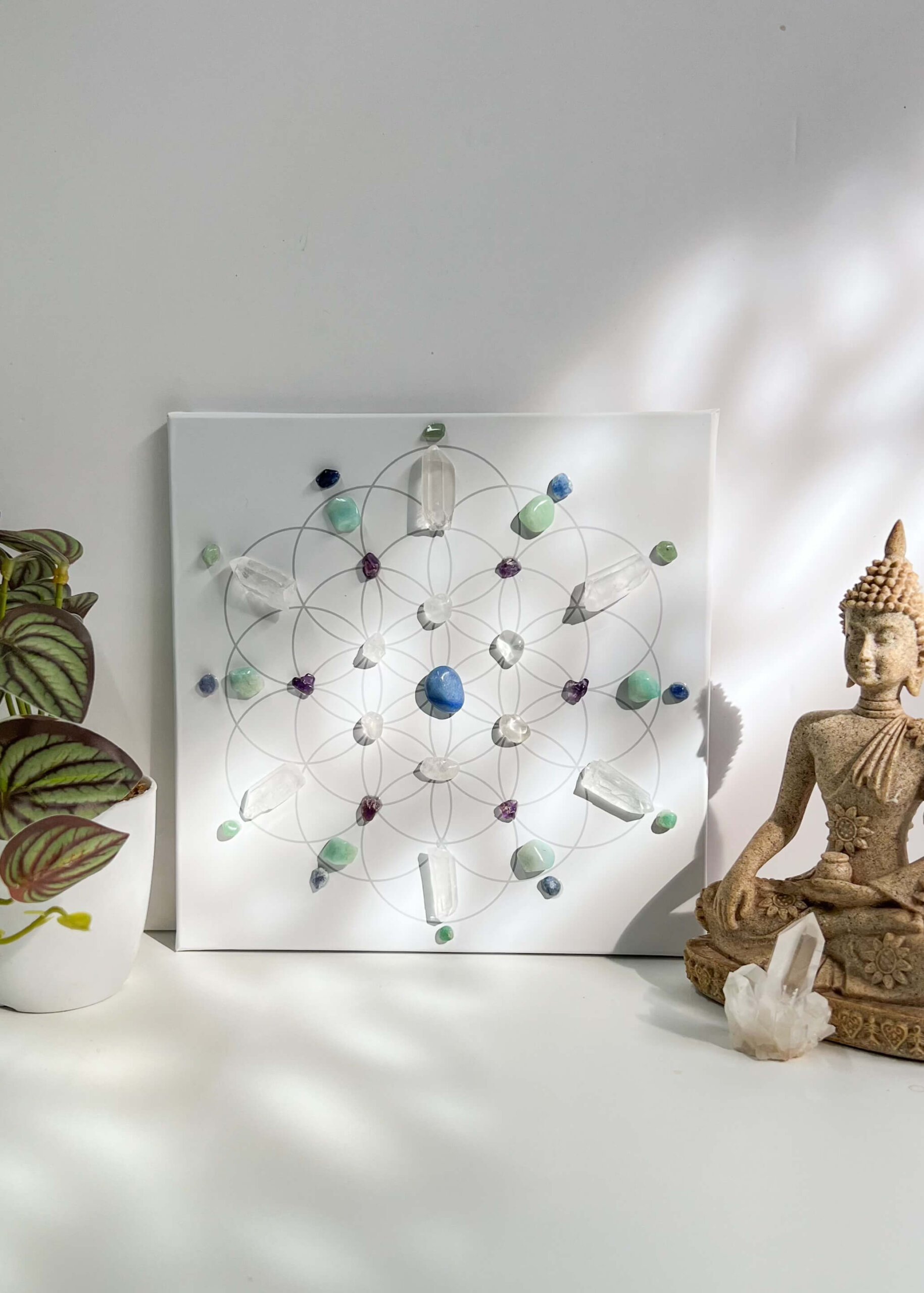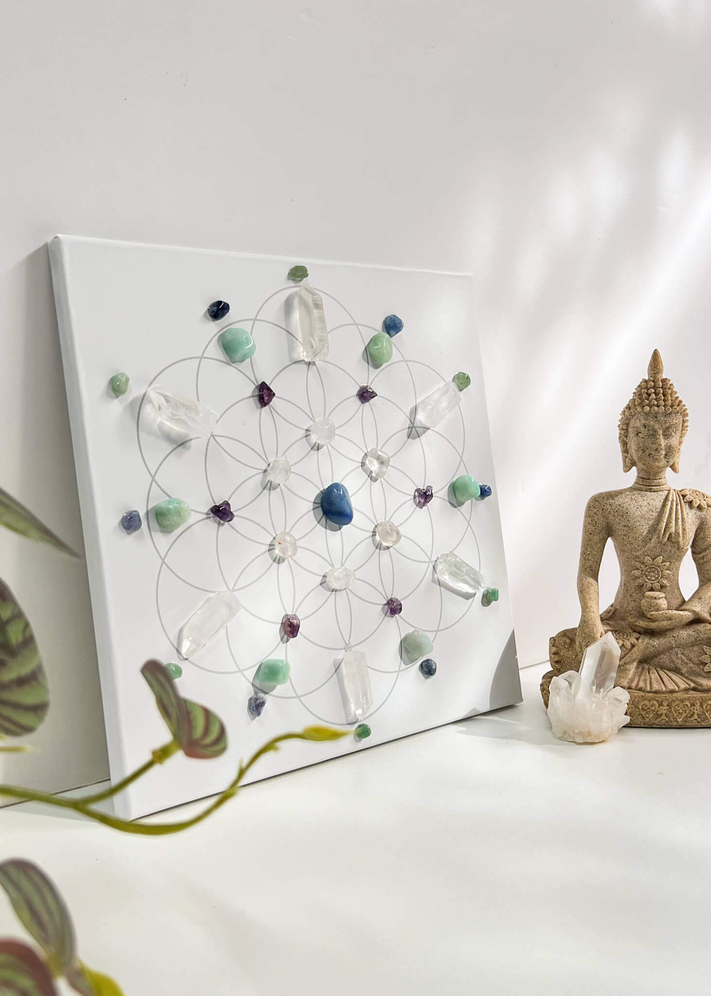 Com cristais cuidadosamente posicionados sobre a geometria da Flor da Vida, é uma peça que une estética, espiritualidade e propósito.