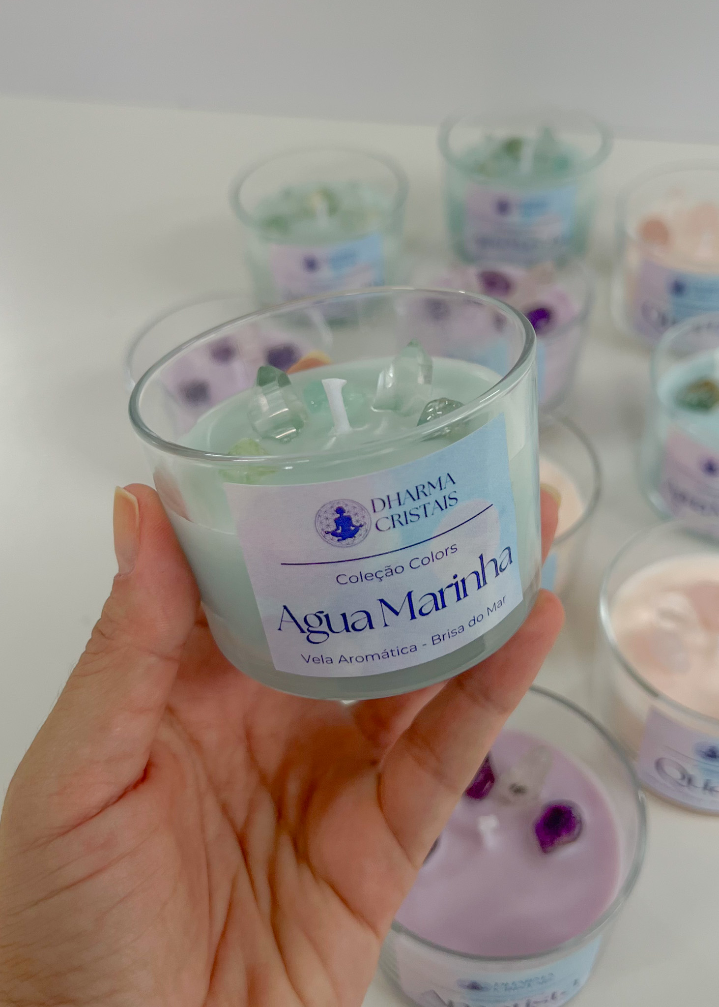 Vela Aromática Água Marinha com Cristais Naturais | Brisa do Mar | Coleção Colors — Dharma Cristais
